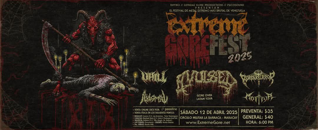 El Extreme Gore Fest XIX Aniversario encabezado por la legendaria banda española Avulsed, junto a Border Terror de Colombia. Representando a Venezuela, se presentarán Abísmal, Mortyr y Vhill. El evento se llevará a cabo el sábado 12 de abril de 2025, en los espacios del Círculo Militar La Barraca, en Maracay, Aragua, Venezuela a partir de las 6:00 p.m. Contando con el patrocinio y aliados como: Darksport, Arte Final Radio (AFR), Cresta Metalica Producciones, Artemisa Producciones y Documetal.