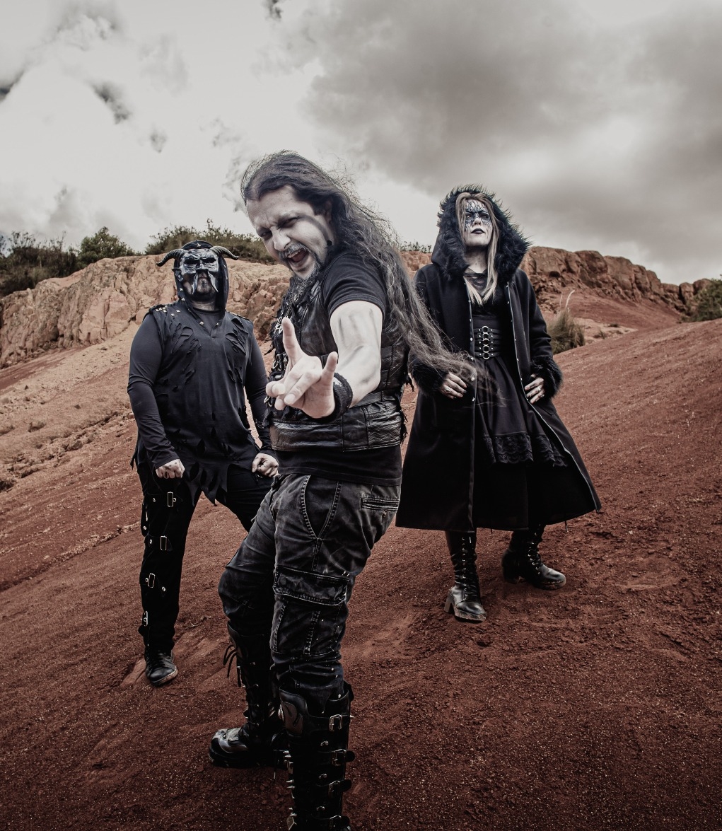 Portada oscura de la banda Luciferian donde una figura encapuchada estilo parca sostiene un reloj de arena en un paisaje lúgubre con niebla, una tumba con velas, cuervos y gatos negros, acompañada del título “Where Rivers of Sorrow Flow”.